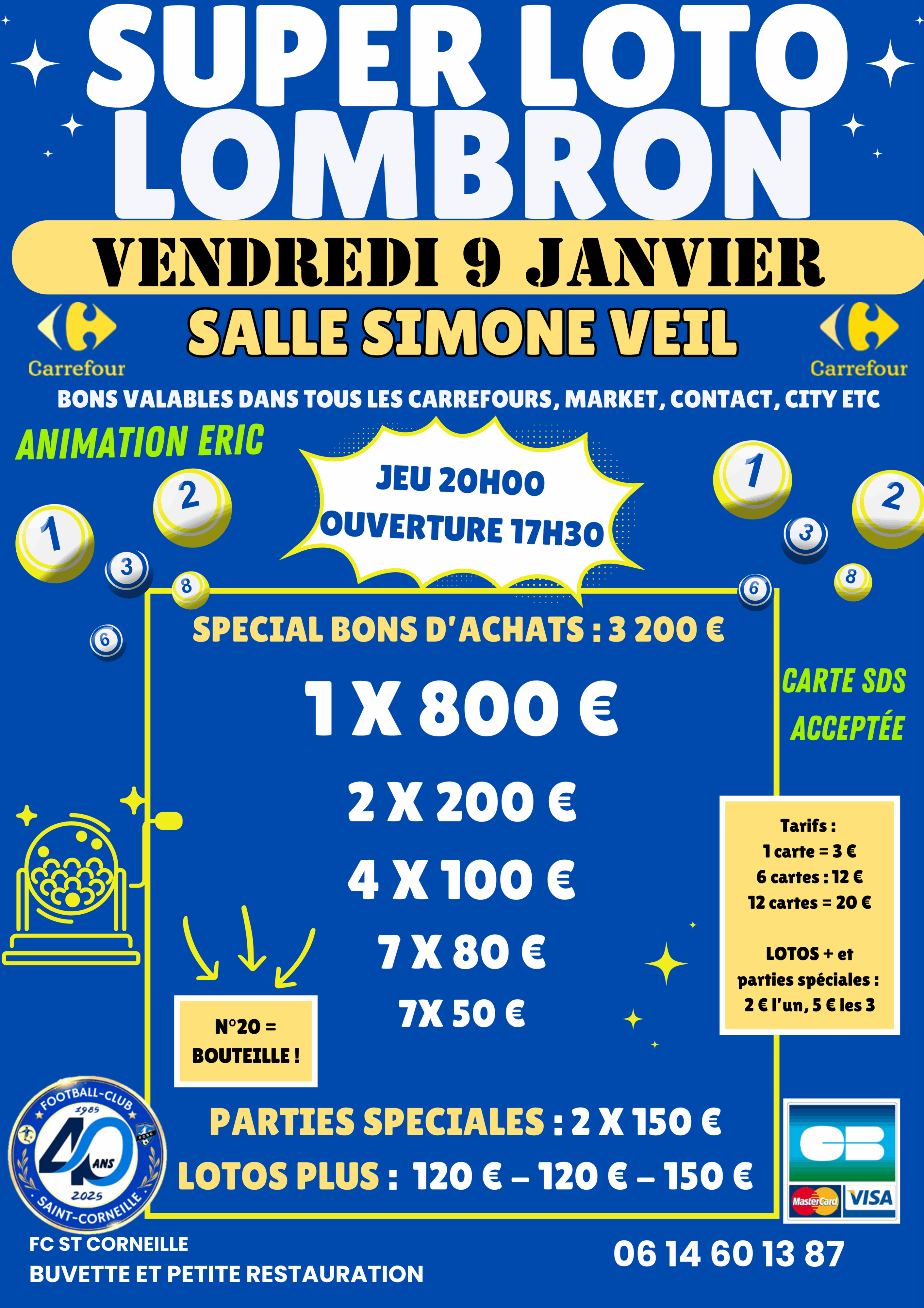 Loto à la Salle Simone Veil de Lombron ouverture des portes 17h30 - Début 20h Nombreux bons d'achat à gagner !